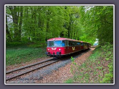 Frühlingsgrüne Buchen und der rote Moorexpress